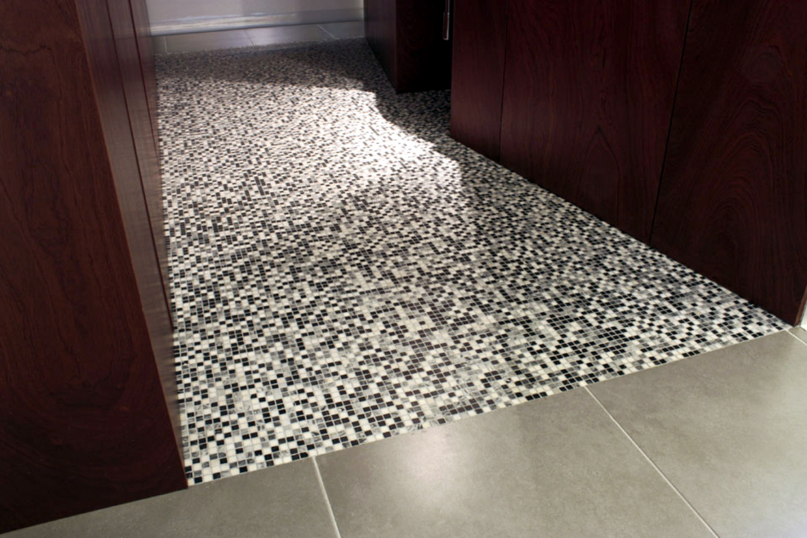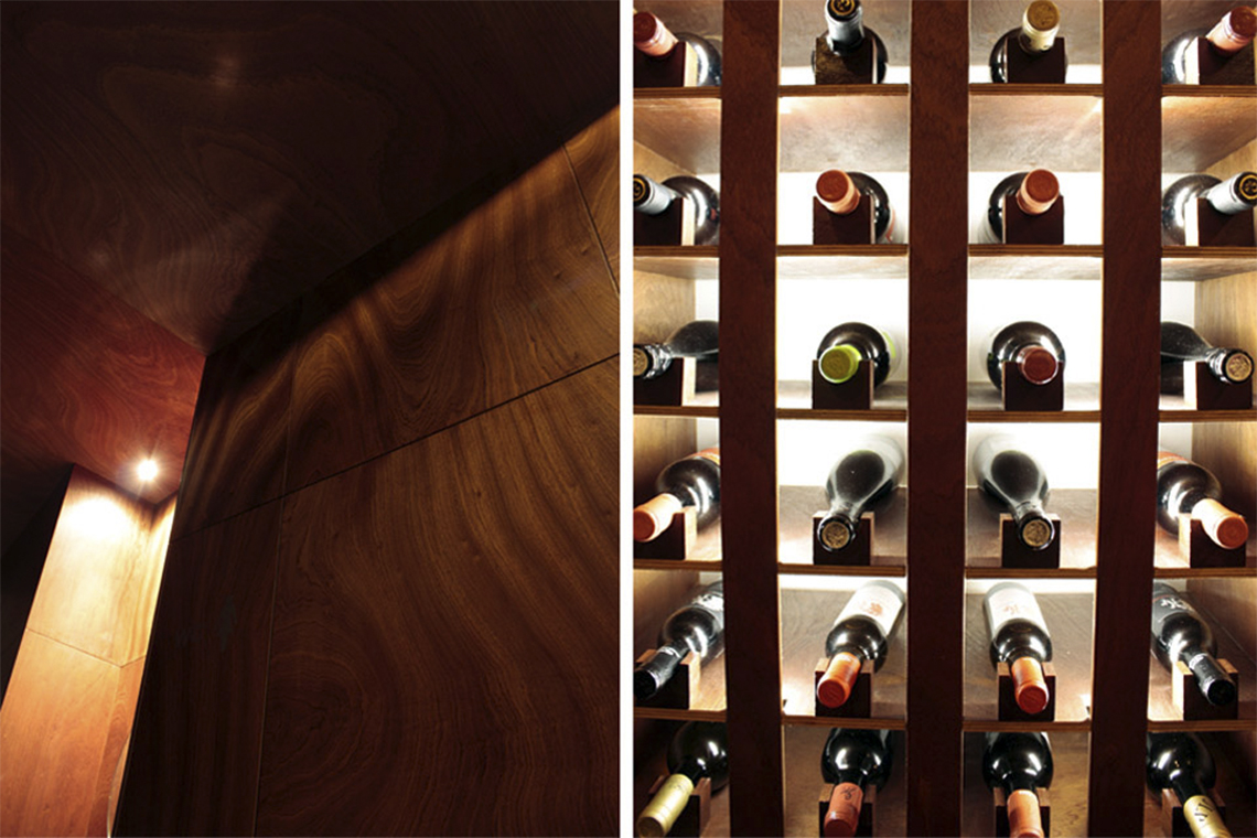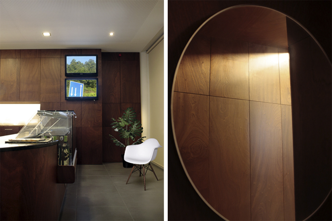 cherry wood and soft grey. On the technical areas, the toilets area acts like a