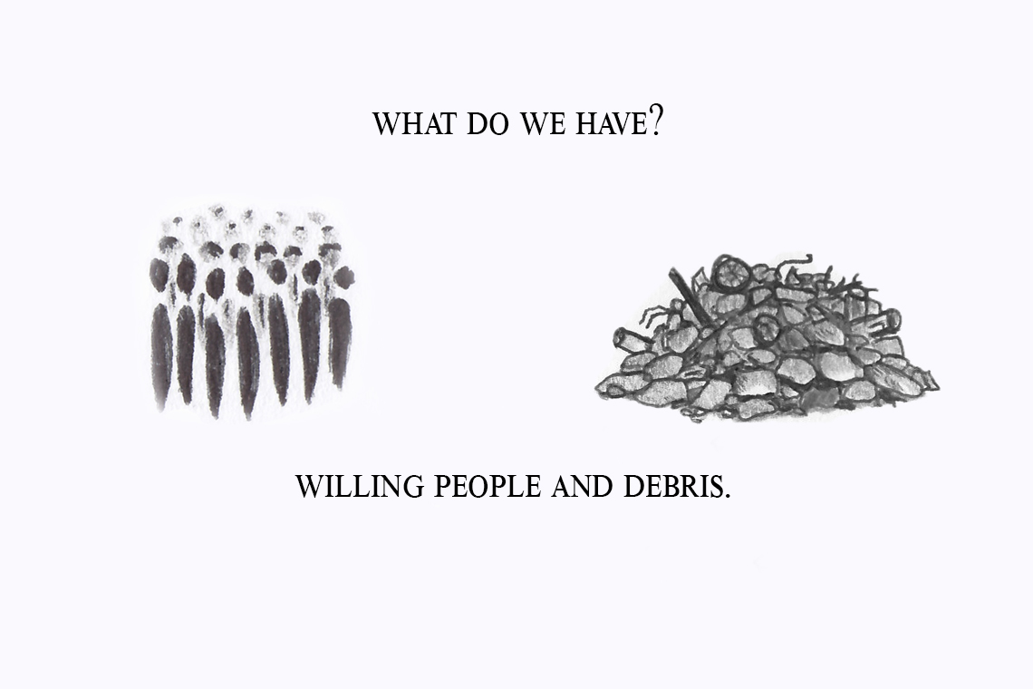 With the shortage of almost everything and the chaos as scenario, the main concern is to the people’s willing of safety and comfort. Our goal points out to the most of the instantaneous solutions: availability of workforce to clean the city devastation, collecting from debris, materials to rebuild, feeling helpful as individual and easily communitarian.