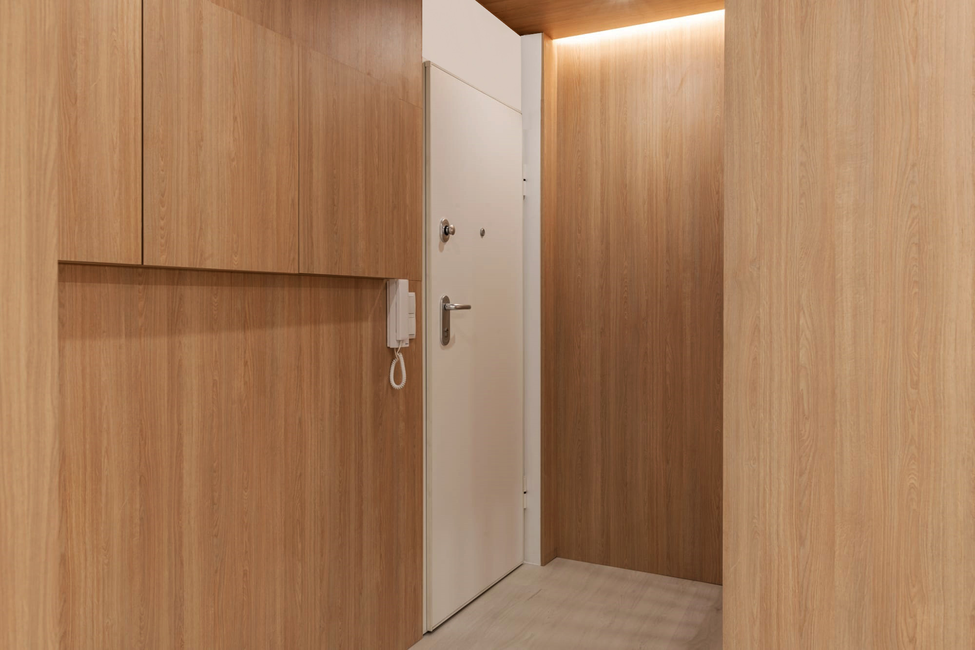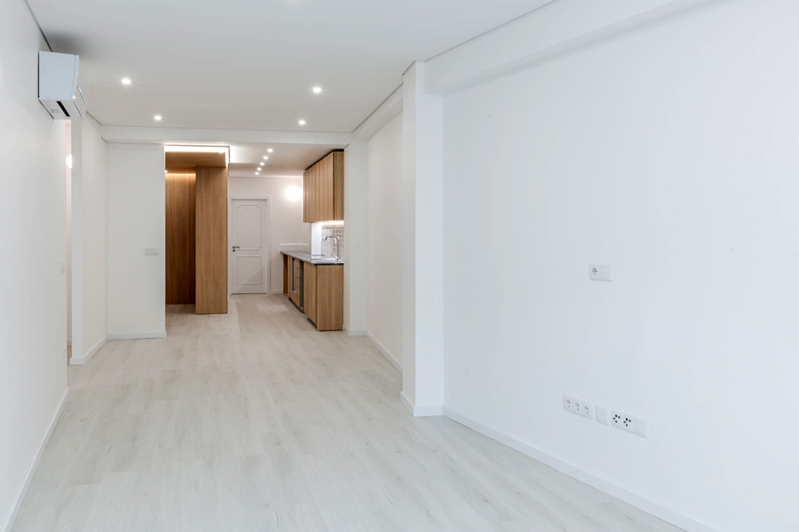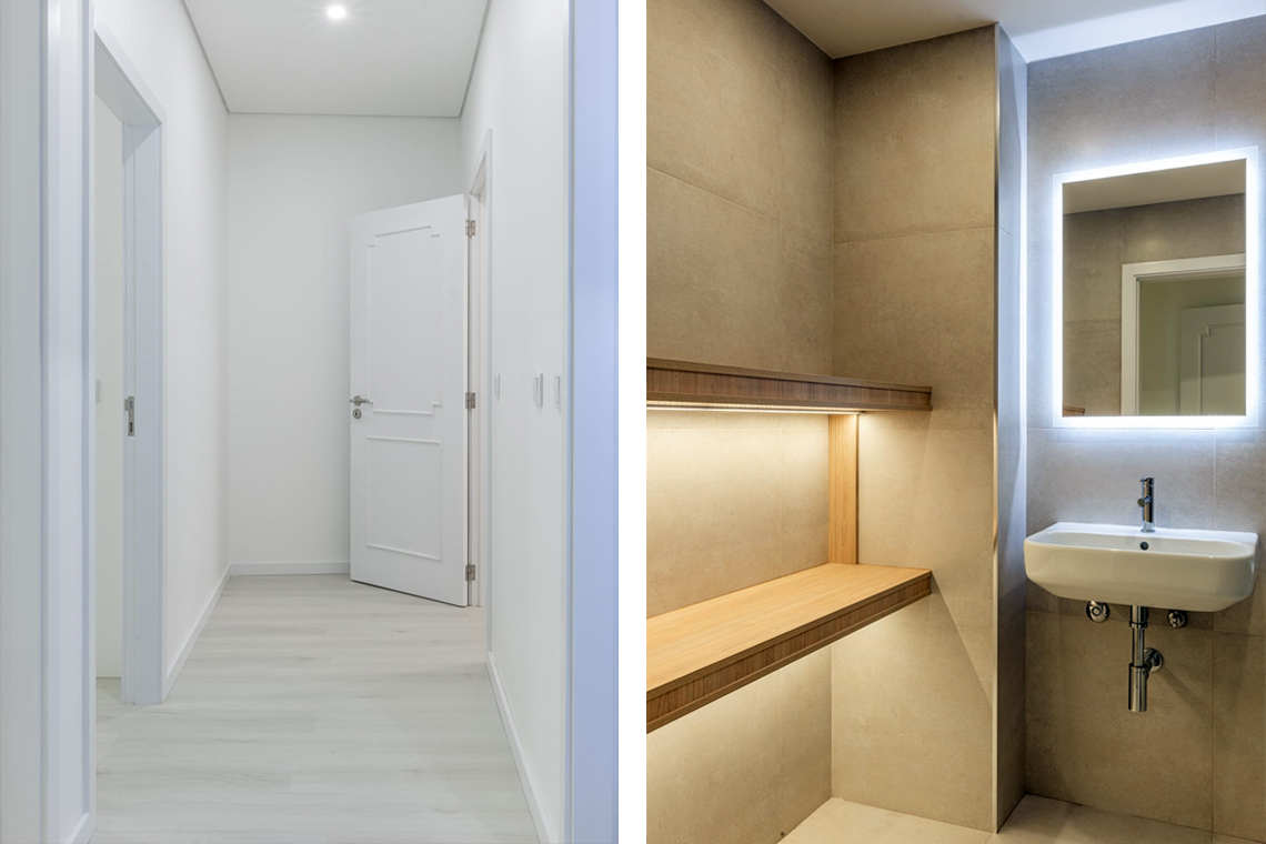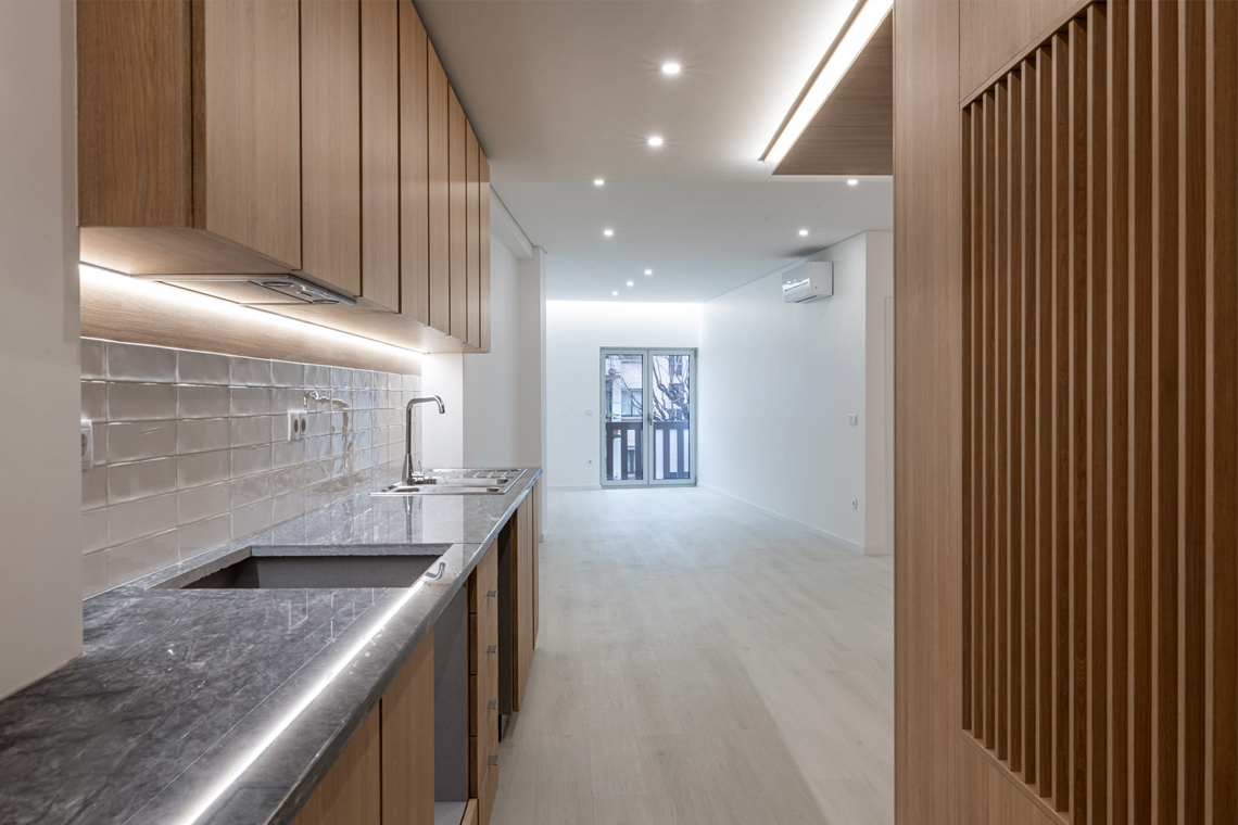 Four office compartments with two bathrooms refurbished into an three bedroom city apartment with three bathrooms, living and dinning room, lobby, laundry and a urban kitchen with american breakfast counter top. A hard challenge made functional, under precepts!